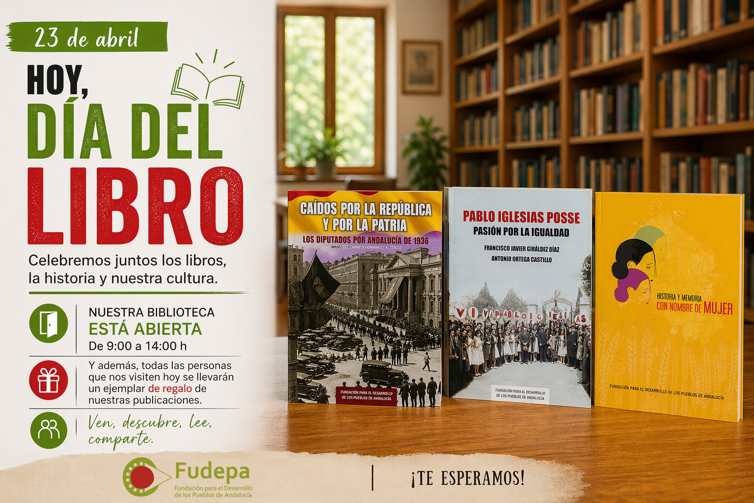 Con motivo del 23 de abril, Día del Libro, la Fundación para el Desarrollo de los Pueblos de Andalucía invita a la ciudadanía a visitar su biblioteca, que permanecerá abierta en horario de mañana, y a conocer sus publicaciones, ofreciendo ejemplares a las personas asistentes.